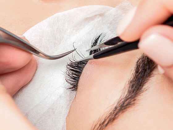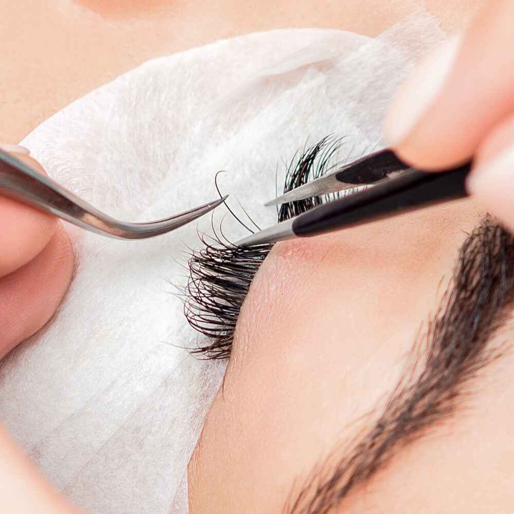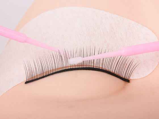 Use tweezers to pick up the extension, dip it in the adhesive, and attach it to the natural lash.